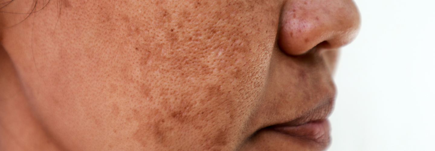 Melasma is commonly seen in darker skin tones as symmetrical brown or greyish patches. Common origins of melasma include overproduction of melanin caused by sunlight exposure.